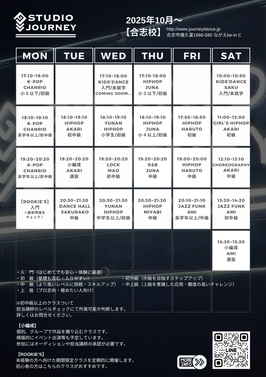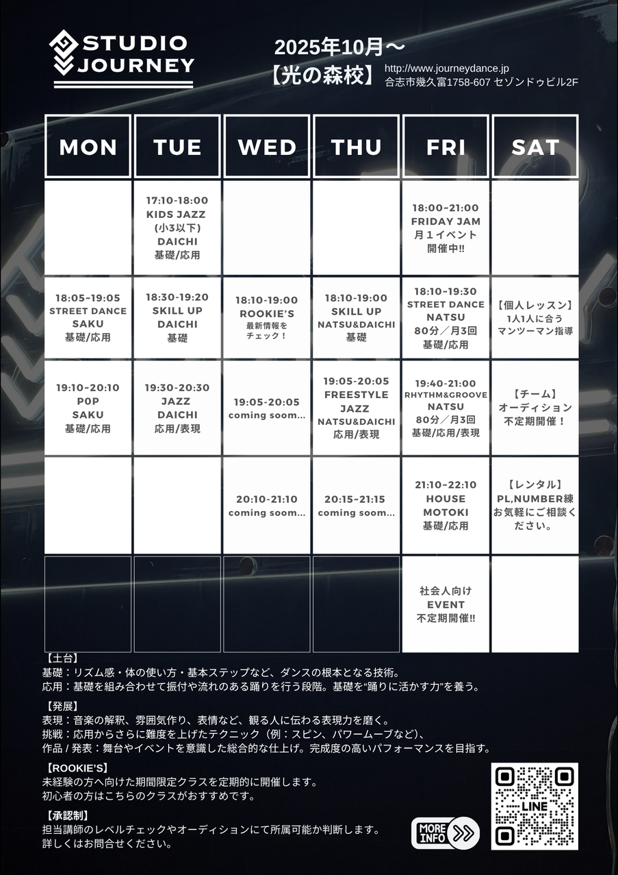熊本で勢いのある旬のダンサーが集まる、秘密基地のようなスタジオです。受講生のレベルに応じてクラスを分け、講師の専門性を活かした少人数~中規模のクラス編成でレッスンを実施しております。参加人数に応じたきめ細やかなサポートにより、安心して学びながらワクワクできるレッスンをお楽しみいただけます。